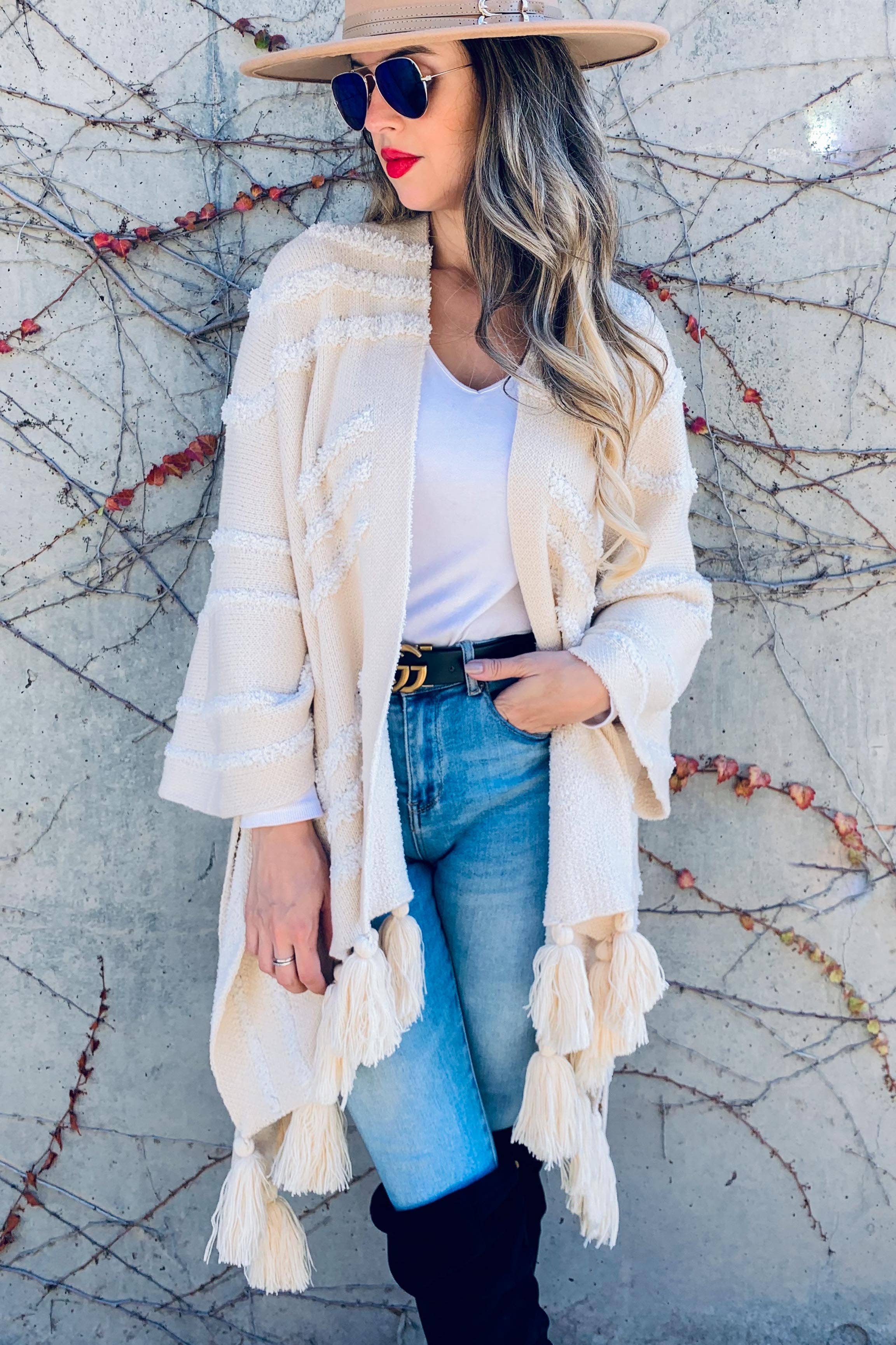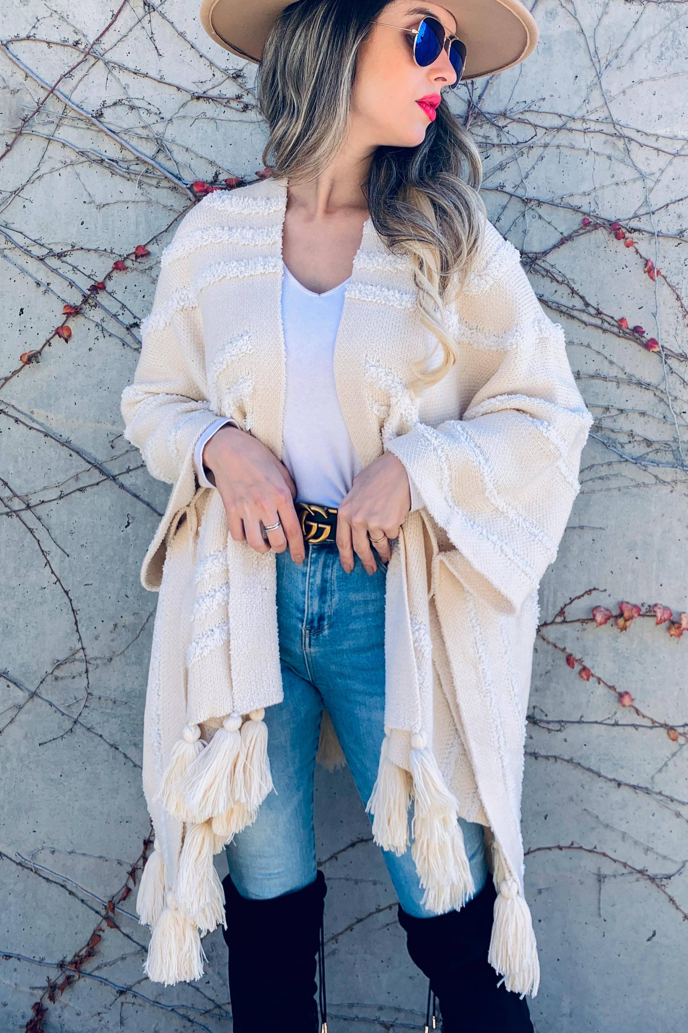Cream Western Textured Pattern With Chunky Tassel Pancho