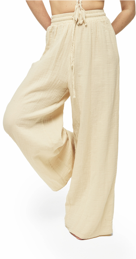 Easy like a coastal breeze, the Sera Cotton Pant is your new go-to for sunlit days and slow evenings. Made from breathable Turkish double gauze, these wide-leg pants feature a relaxed, full-length silhouette and a soft elastic waistband with a braided drawstring tie.