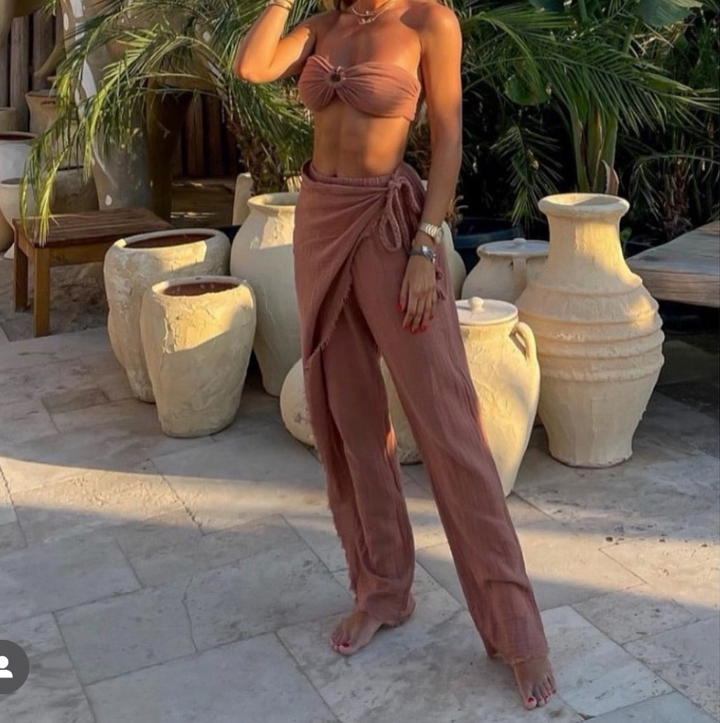 Flowy, lightweight, and irresistibly chic, the Manav Pants are designed for those who embrace effortless style. Featuring a unique wrap-front design with a braided tie detail, these breathable muslin pants drape beautifully for a flattering silhouette. The raw-edged hem adds a touch of relaxed bohemian charm, making them perfect for beachside strolls, city adventures, or cozy days at home.