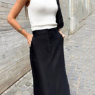 This elegant A-line maxi skirt is crafted from a blend of cotton broadcloth and polyester, ensuring durability with a refined texture. Designed for the summer season, its long length and subtle slit add both comfort and a sophisticated silhouette suitable for commuting or elegant occasions. Available in black and sizes S to L, this non-stretch skirt combines timeless style with effortless wearability. Lightweight at 253g, it embodies a versatile, global appeal that elevates any wardrobe with understated grace.