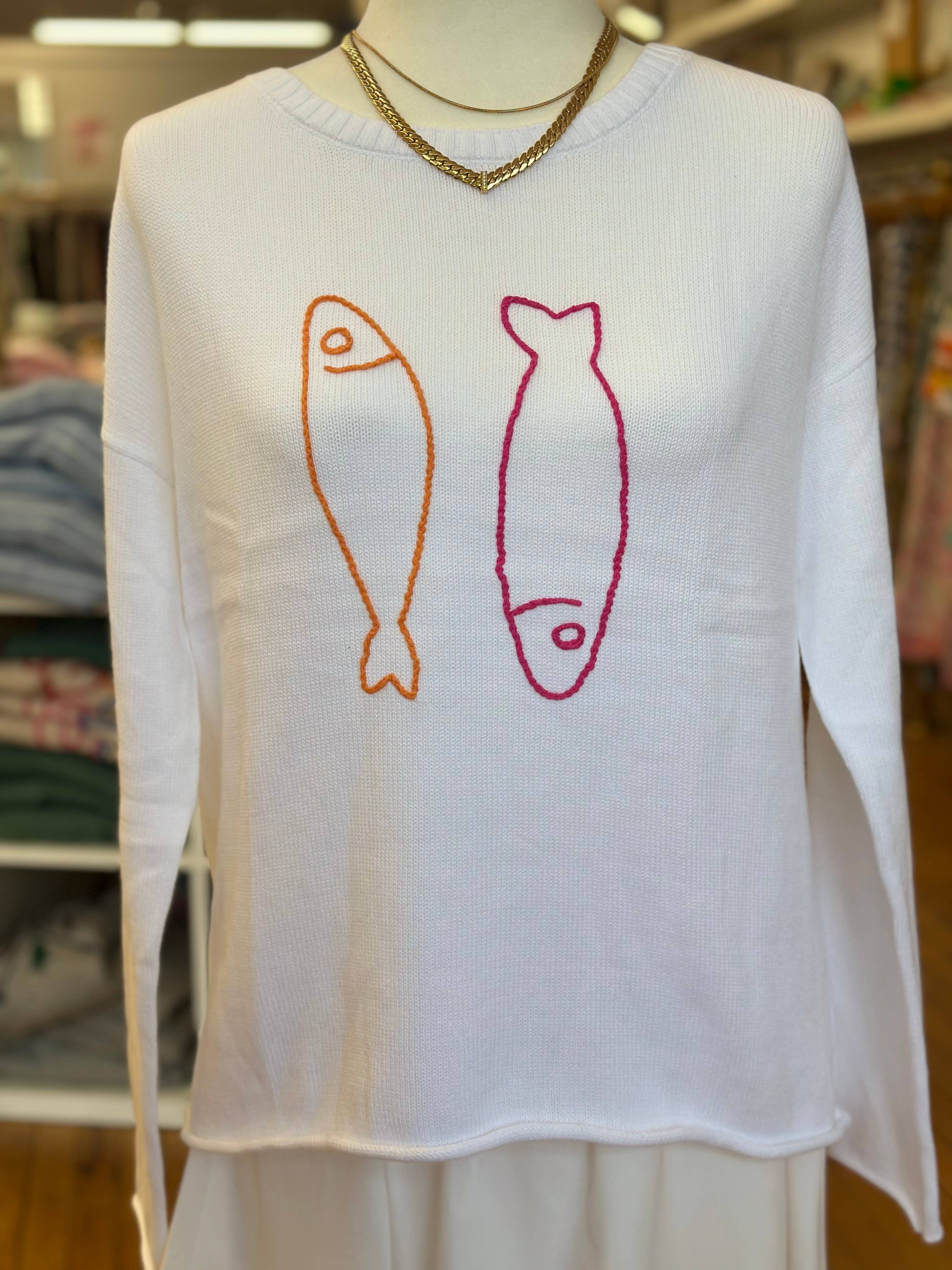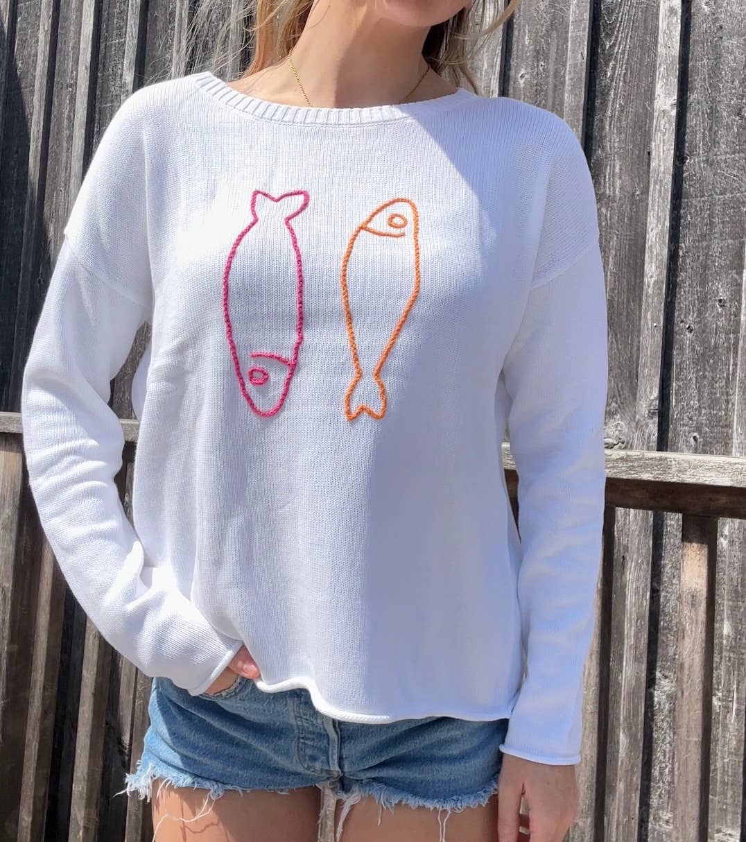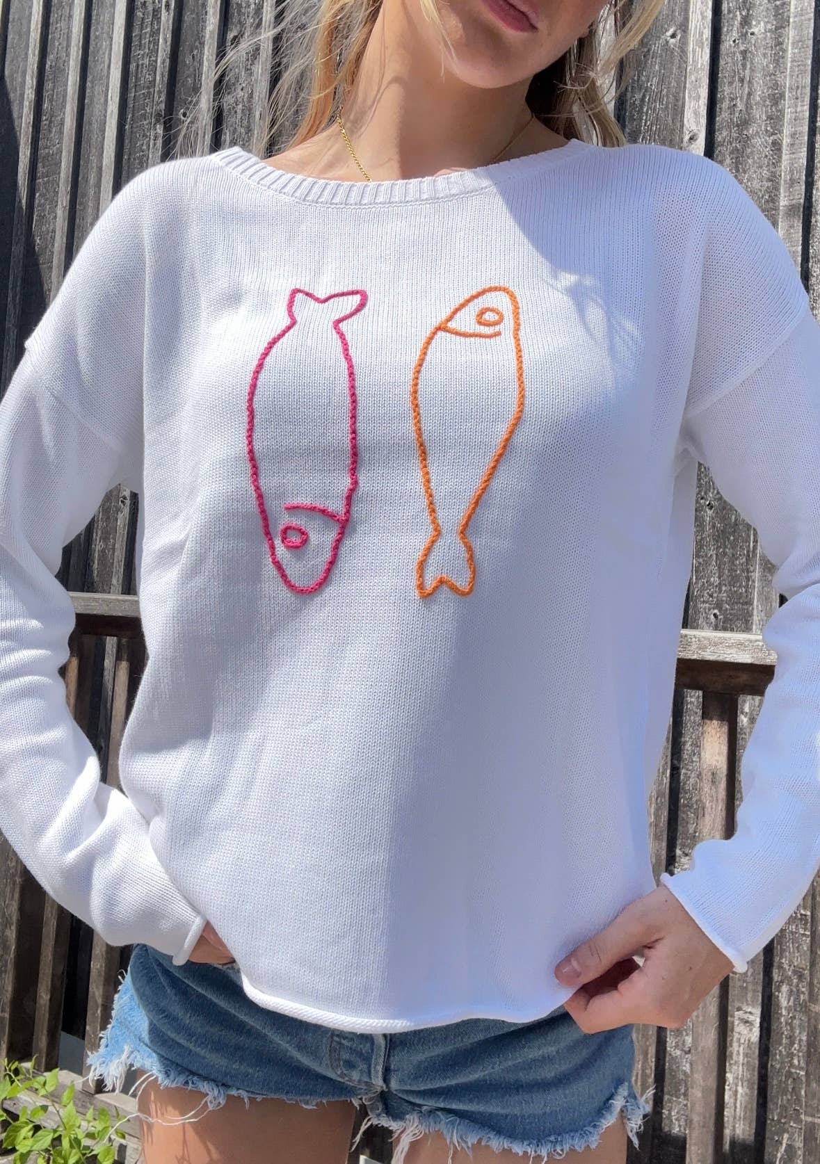 Discover our latest obsession: the Twin Sardines embroidered on the front of our easiest-fit boxy sweater. Crafted from 100% cotton, this white sweater offers exceptional comfort with an updated design featuring longer sleeves for added style and coziness. Perfectly blending casual sophistication and playful detail, it’s a versatile piece that elevates everyday wear.